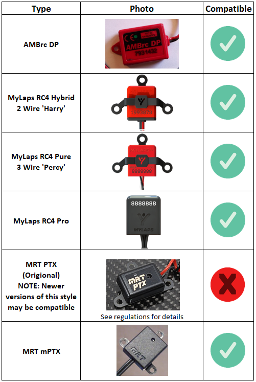 We will be using MyLaps RC4 decoders so you must have either an Mylaps RC4 or newer styles of MRT transponder. Click here for a table of compatible transponders.